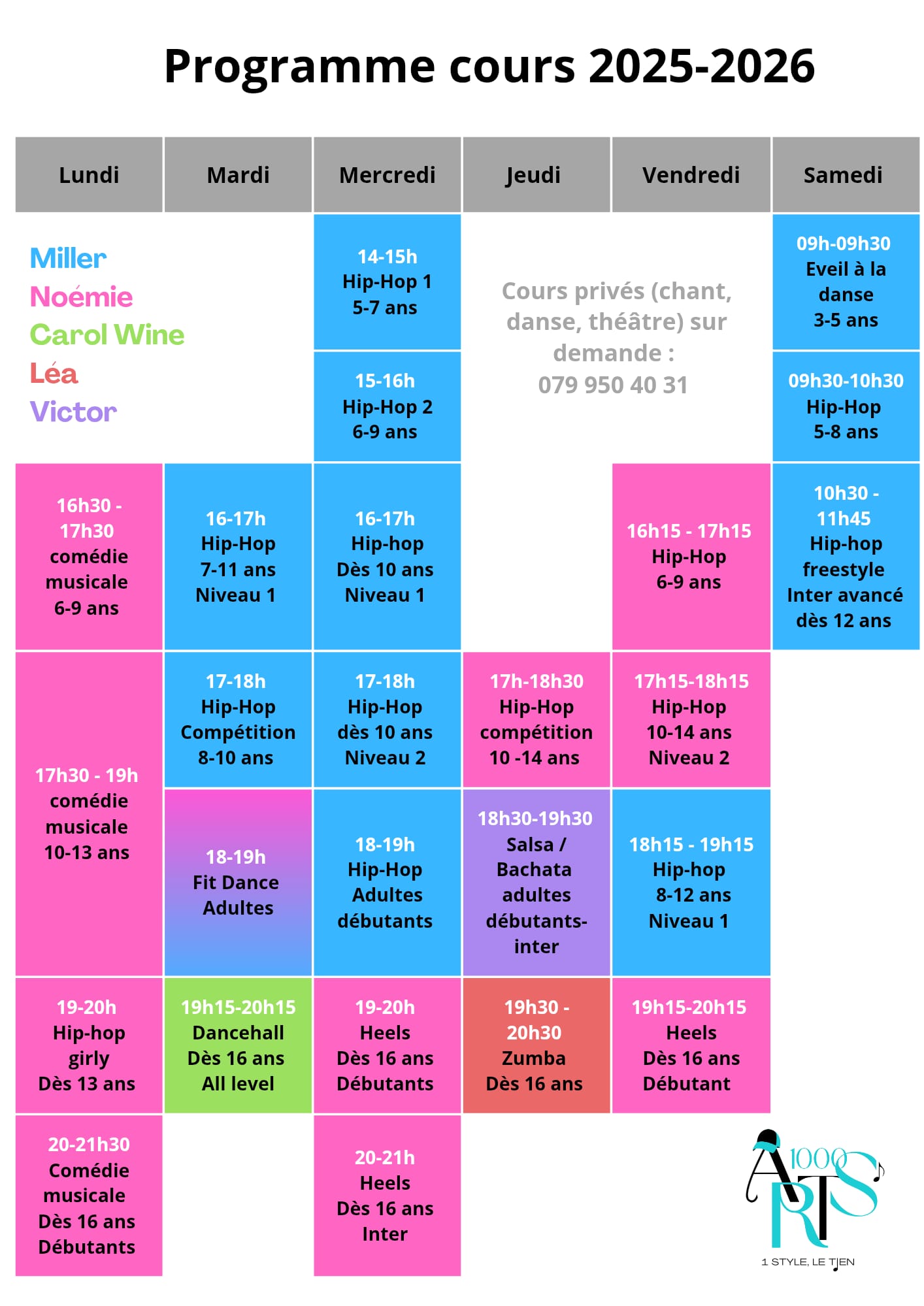 La Comédie Musicale est un art complet qui mélange danse, chant et théâtre. Inspirée des grands spectacles de Broadway et des films musicaux, elle permet de vivre pleinement la scène en développant l’expression artistique, la présence et la confiance en soi.